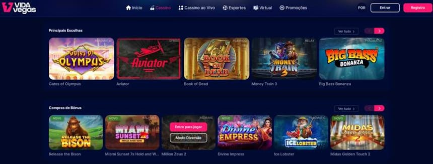 Entre os jogos mais populares do VidaVegas estão títulos como Gates of Olympus, Aviator, Book of Dead e Money Train. Esses jogos, fornecidos por grandes desenvolvedores como Pragmatic, Spribe e PlaynGo, atraem milhões de jogadores pela web todos os dias, e não seria diferente no VidaVegas.