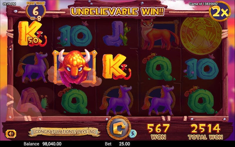 O ícone do búfalo é o símbolo Wild nesse caça-níquel. Ele substitui todos os outros símbolos, exceto o scatter. Durante o bônus de Jogos Grátis, os ganhos contendo um símbolo Wild também podem receber multiplicadores de aposta de até 15x.